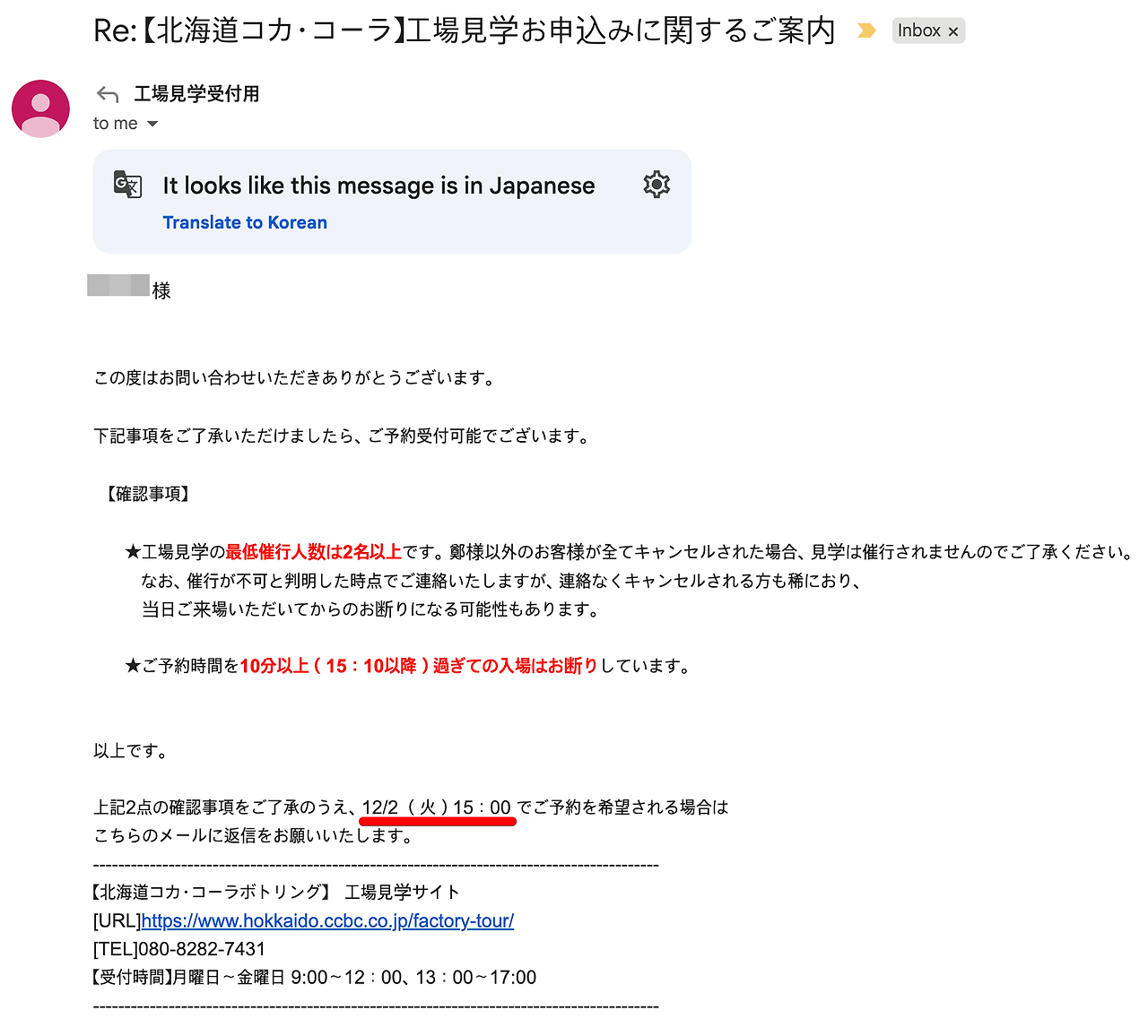I applied for the factory tour, but encountered a problem. Only groups of 2 or more were accepted. Since I was traveling alone, I couldn't book for 2 people. When I tried booking for 2 people but indicated 1 adult in the party composition field, I received a rejection email. The email stated that the policy required 2 or more people. As expected from Japan, the land of manuals. Although the email said replies wouldn't be answered, I responded anyway. I wrote that I was traveling alone and really wanted to visit.